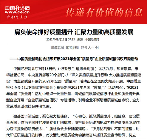 中國經(jīng)濟網(wǎng):肩負(fù)使命抓好質(zhì)量提升 匯聚力量助高質(zhì)量發(fā)展——中國質(zhì)量檢驗協(xié)會組織開展2021年全國“質(zhì)量月”企業(yè)質(zhì)量誠信倡議專題活動