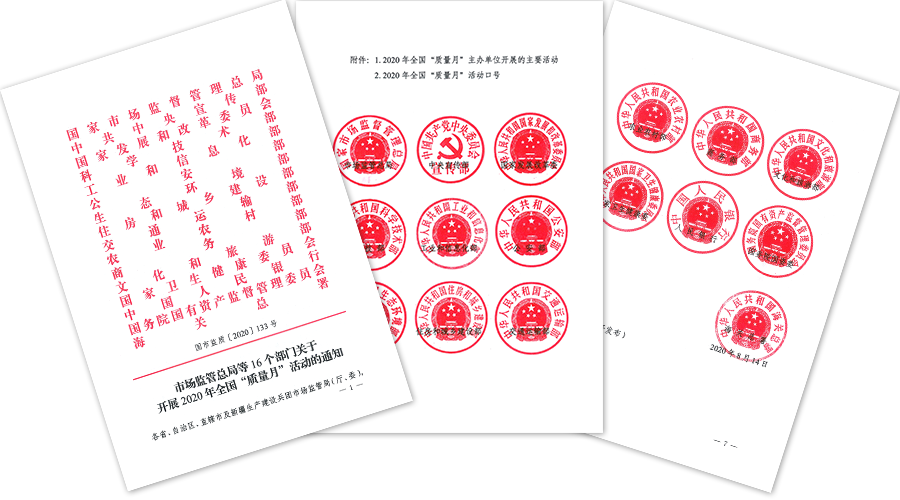 市場監(jiān)管總局、中央宣傳部、國家發(fā)展改革委、科技部、工業(yè)和信息化部等2020年全國“質量月”活動主辦單位在《市場監(jiān)管總局等16個部門關于開展2020年全國“質量月”活動的通知》(國市監(jiān)質〔2020〕133號)中明確指出:為深入學習貫徹習近平新時代中國特色社會主義思想和黨的十九大精神,認真落實黨中央、國務院關于質量工作的重大決策部署,做好“六穩(wěn)”工作、落實“六?!比蝿眨袑嵕S護市場秩序,著力優(yōu)化營商環(huán)境,全面提升產(chǎn)品、工程和服務質量,為建設質量強國、決勝全面建成小康社會提供有力支撐,市場監(jiān)管總局等16個部門定于2020年9月聯(lián)合開展全國“質量月”活動。